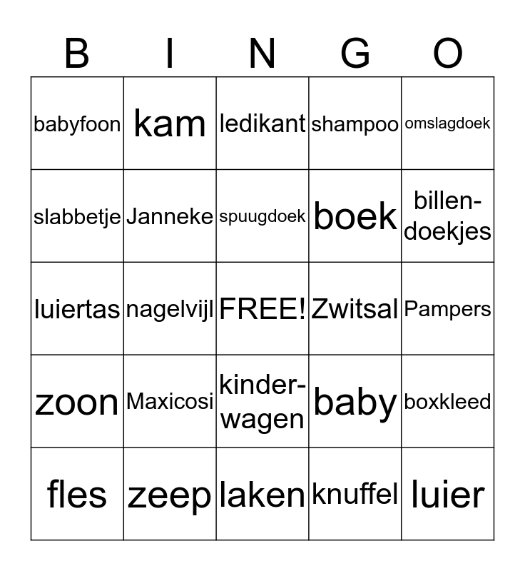 This bingo card has a free space and 43 words: speen, luier, box, fles, romper, knuffel, ledikant, commode, omslagdoek, zeep, shampoo, Zwitsal, kinder-wagen, Maxicosi, deken, laken, molton, luiertas, aankleed-kussen, billen-doekjes, kam, thermo-meter, borst-voeding, babyfoon, luieruitslag, Pampers, sokjes, mobiel, baby, zoon, kast, boxkleed, speelgoed, nagelvijl, talkpoeder, hydrofiele luiers, washand, spuugdoek, slabbetje, boek, Jip, Janneke and speelkleed.
