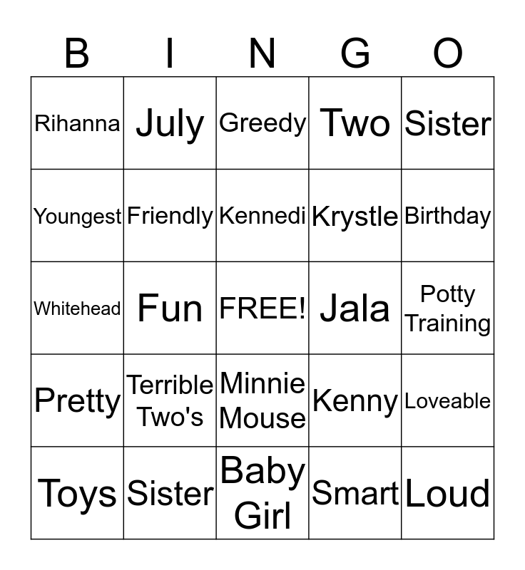 This bingo card has a free space and 24 words: Terrible Two's, Sister, Kennedi, Toys, Sister, Rihanna, Youngest, July, Jala, Minnie Mouse, Krystle, Whitehead, Kenny, Loveable, Friendly, Smart, Potty Training, Greedy, Birthday, Fun, Loud, Pretty, Two and Baby Girl.