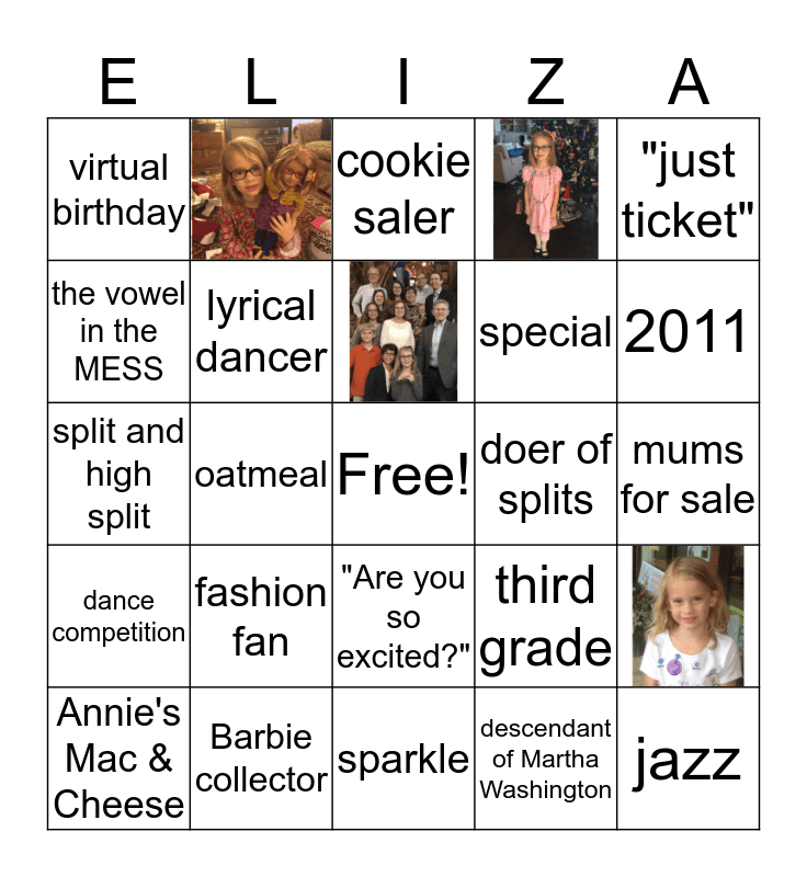 This bingo card has 5 images, a free space and 24 words: Annie's Mac & Cheese, Jump Start Dance Studio, oatmeal, March 26, virtual birthday, cookie saler, lyrical dancer, fashion fan, doer of splits, Barbie collector, mums for sale, jazz, sparkle, descendant of Martha Washington, 2011, Girl Scout, "Are you so excited?", dance competition, "just ticket", split and high split, third grade, leftie, special and the vowel in the MESS.