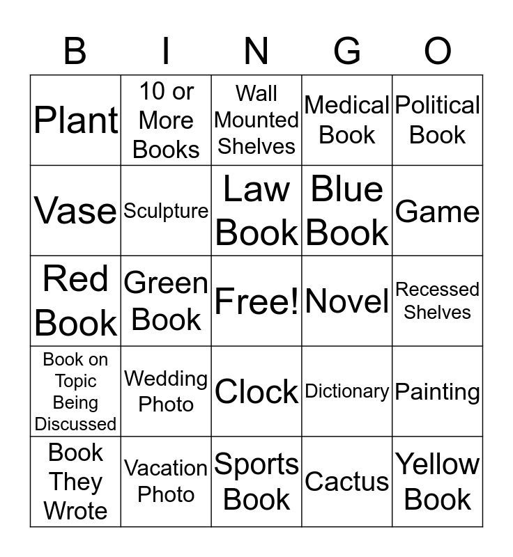 This bingo card has a free space and 24 words: Wedding Photo, Vacation Photo, Law Book, Book They Wrote, Political Book, Plant, Vase, 10 or More Books, Novel, Clock, Blue Book, Red Book, Dictionary, Painting, Sculpture, Cactus, Recessed Shelves, Wall Mounted Shelves, Game, Green Book, Yellow Book, Book on Topic Being Discussed, Medical Book and Sports Book.