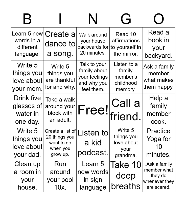 This bingo card has a free space and 24 words: Create a list of 20 things you want to do when you grow up., Run around your pool 10x., Talk to your family about your feelings and why you feel them., Clean up a room in your house., Read a book in your backyard., Learn 5 new words in a different language., Write 5 things you love about your mom., Create a dance to a song., Call a friend., Listen to a kid podcast., Listen to a family member's childhood memory., Drink five glasses of water in one day., Write 5 things you love about your grandma., Practice Yoga for 10 minutes., Write 5 things you are thankful for and why., Take 10 deep breaths, Help a family member cook., Walk around your house backwards for 20 minutes., Ask a family member what makes them happy., Take a walk around your block with an adult., .Ask a family member what they do whenever they are scared., Write 5 things you love about your dad., Read 10 affirmations to yourself in the mirror. and Learn 5 new words in sign language.