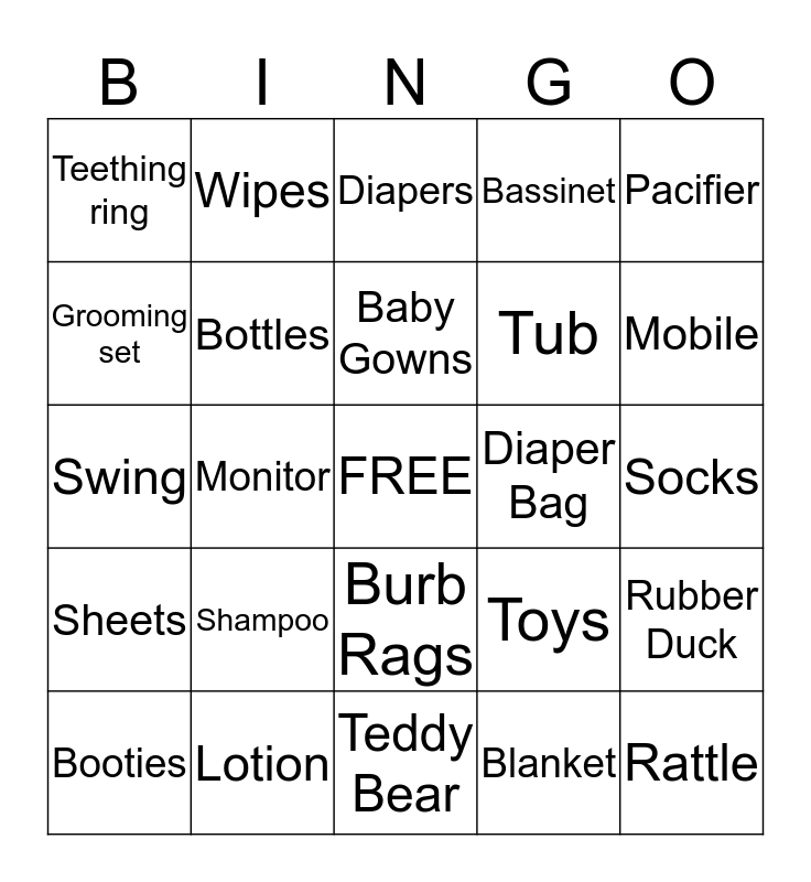 This bingo card has a free space and 24 words: Shampoo, Lotion, Baby Gowns, Booties, Pacifier, Teething ring, Grooming set, Wipes, Diaper Bag, Burb Rags, Tub, Swing, Toys, Rubber Duck, Bottles, Blanket, Socks, Diapers, Mobile, Monitor, Rattle, Sheets, Bassinet and Teddy Bear.