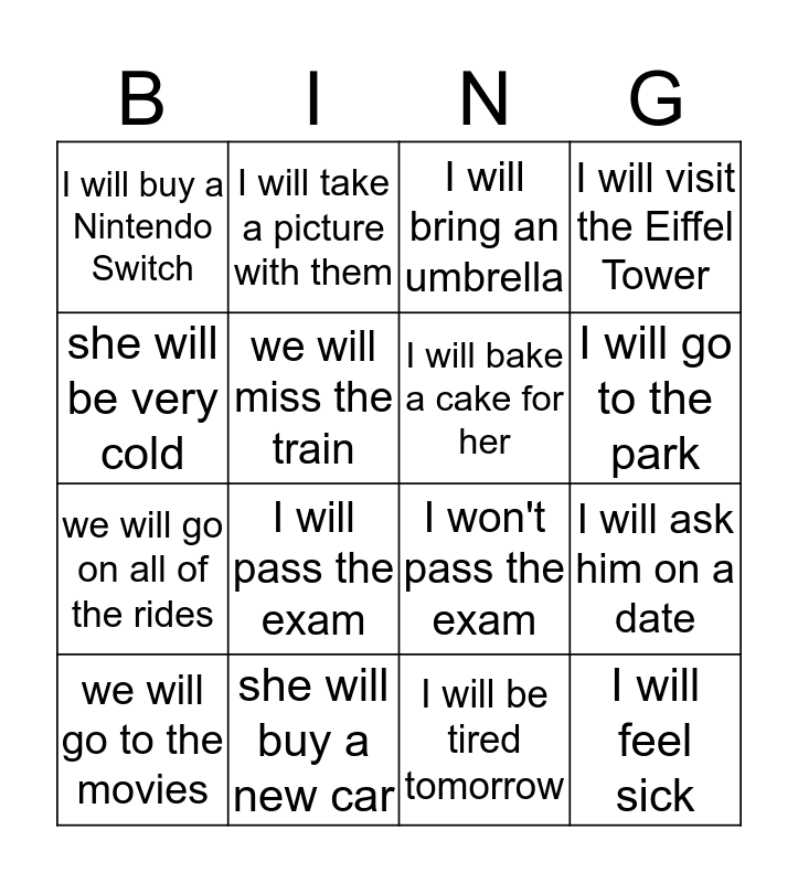 This bingo card has 18 words: I will pass the exam, I will feel sick, I will bring an umbrella, I will buy a Nintendo Switch, I won't pass the exam, I will visit the Eiffel Tower, we will go to the movies, I will take a picture with them, I will go to the park, we will go on all of the rides, I will be tired tomorrow, she will be very cold, I will ask him on a date, we will miss the train, I will bake a cake for her, his teacher will be angry, she will buy a new car and I will study chemistry.