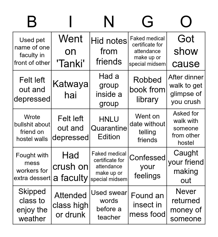This bingo card has a free space and 24 words: Had crush on a faculty, Attended class high or drunk, Had a group inside a group, Skipped class to enjoy the weather, Got show cause, Used pet name of one faculty in front of other, Felt left out and depressed, Went on 'Tanki', Went on date without telling friends, Faked medical certificate for attendance make up or special midsem, Robbed book from library, Wrote bullshit about friend on hostel walls, Confessed your feelings, Caught your friend making out, Katwaya hai, Found an insect in mess food, Asked for walk with someone from other hostel, Hid notes from friends, After dinner walk to get glimpse of you crush, Felt left out and depressed, Never returned money of someone, Fought with mess workers for extra dessert, Faked medical certificate for attendance make up or special midsem and Used swear words before a teacher.