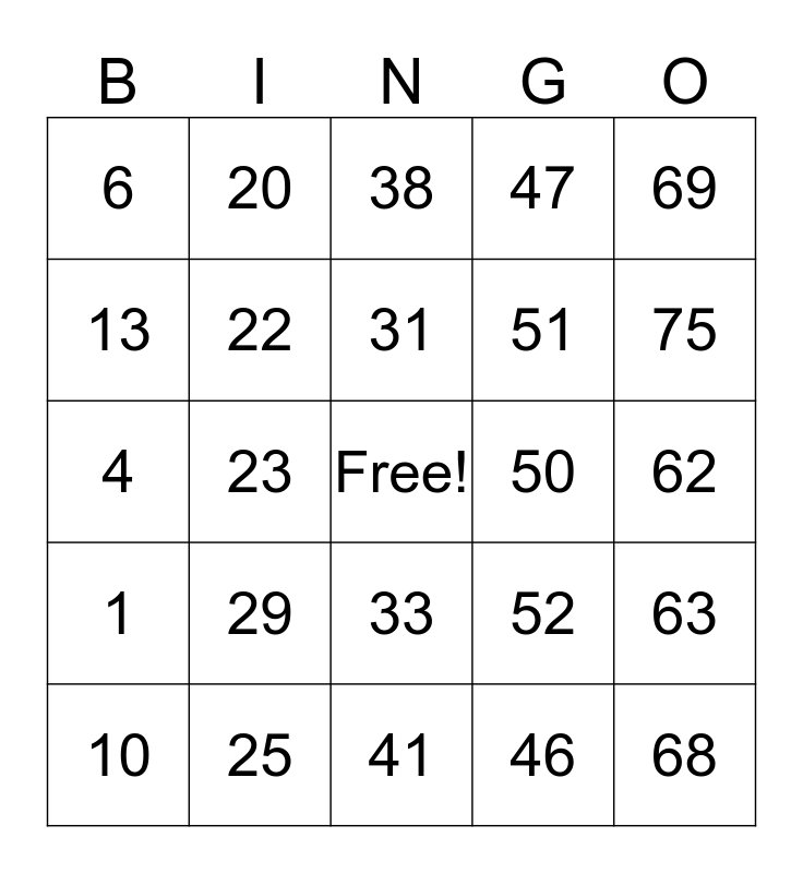 This bingo card has a free space and 24 words: 10, 29, 31, 46, 69, 6, 20, 38, 50, 62, 4, 22, 52, 63, 13, 25, 41, 47, 75, 1, 23, 33, 51 and 68.
