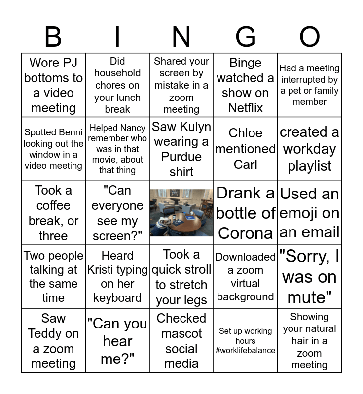 This bingo card has a free space and 24 words: Heard Kristi typing on her keyboard, "Can you hear me?", Saw Kulyn wearing a Purdue shirt, Saw Teddy on a zoom meeting, Had a meeting interrupted by a pet or family member, Wore PJ bottoms to a video meeting, Spotted Benni looking out the window in a video meeting, Did household chores on your lunch break, Drank a bottle of Corona, Took a quick stroll to stretch your legs, Chloe mentioned Carl, Took a coffee break, or three, Downloaded a zoom virtual background, "Sorry, I was on mute", Helped Nancy remember who was in that movie, about that thing, Set up working hours #worklifebalance, Used an emoji on an email, Shared your screen by mistake in a zoom meeting, created a workday playlist, "Can everyone see my screen?", Showing your natural hair in a zoom meeting, Two people talking at the same time, Binge watched a show on Netflix and Checked mascot social media.