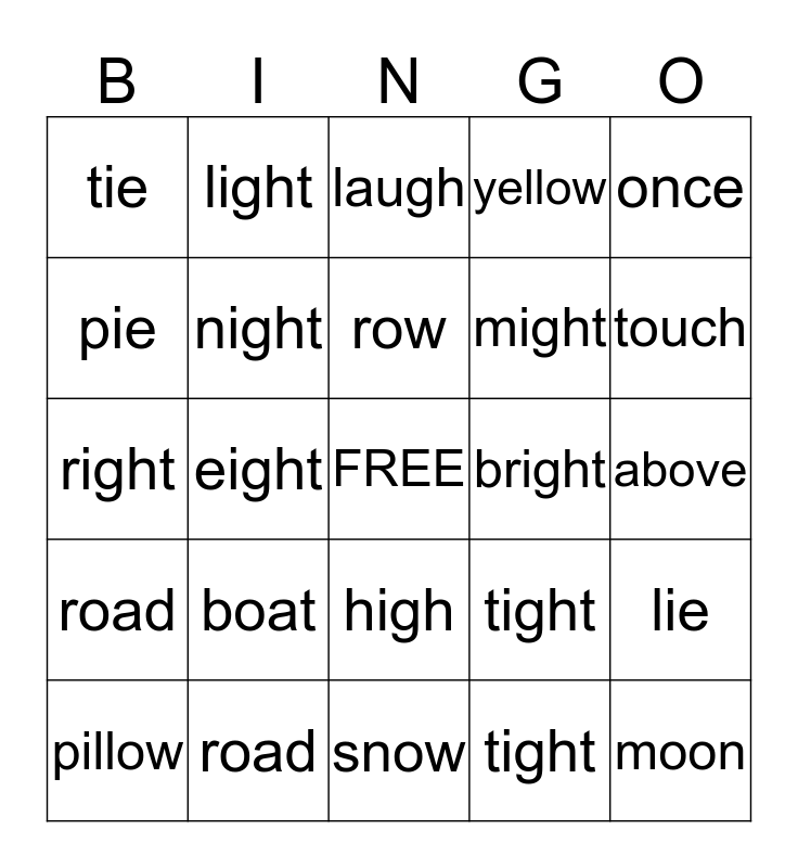 This bingo card has a free space and 24 words: boat, road, row, pillow, once, tie, pie, light, bright, high, might, right, tight, lie, night, tight, above, laugh, touch, eight, moon, road, yellow and snow.