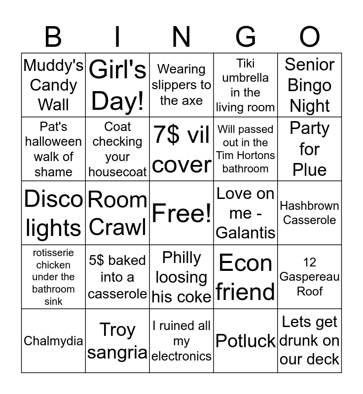 This bingo card has a free space and 31 words: I ruined all my electronics, Emma pukes up one single fry, Room Crawl, Joe's, Muddy's Candy Wall, Wearing slippers to the axe, Coat checking your housecoat, Econ friend, Love on me - Galantis, Potluck, Hashbrown Casserole, Lets get drunk on our deck, Third floor of willow, Jack taking his shirt off, Party for Plue, Dish fairy, 12 Gaspereau Roof, 5$ baked into a casserole, rotisserie chicken under the bathroom sink, Philly loosing his coke, Senior Bingo Night, 7am in the morning, Chalmydia, Girl's Day!, Will passed out in the Tim Hortons bathroom, Pat's halloween walk of shame, Tiki umbrella in the living room, Disco lights, Troy sangria, 7$ vil cover and Southwest Chicken Sandwich.