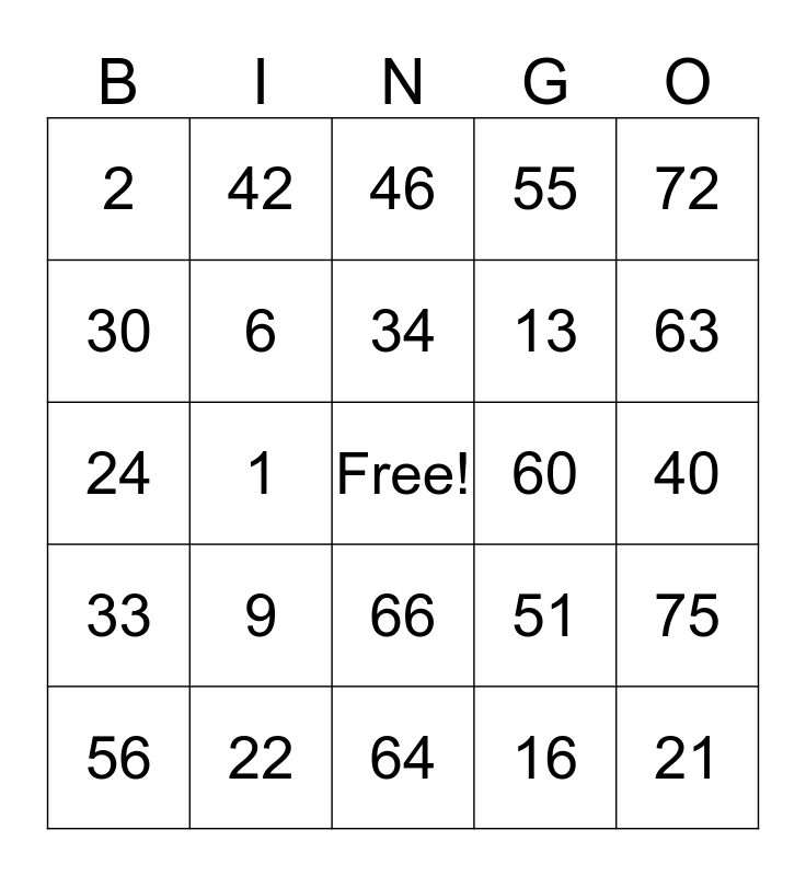 This bingo card has a free space and 24 words: 9, 22, 34, 56, 72, 2, 30, 42, 60, 66, 13, 24, 51, 75, 6, 16, 40, 46, 63, 1, 21, 33, 55 and 64.