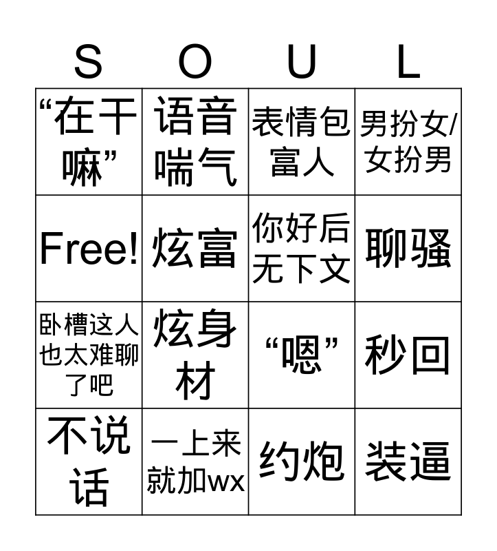 This bingo card has 16 words: 一上来就加wx, 秒回, 表情包富人, “在干嘛”, 卧槽这人也太难聊了吧, 语音喘气, “嗯”, 约炮, Free!, 炫富, 不说话, 男扮女/女扮男, 炫身材, 聊骚, 你好后无下文 and 装逼.