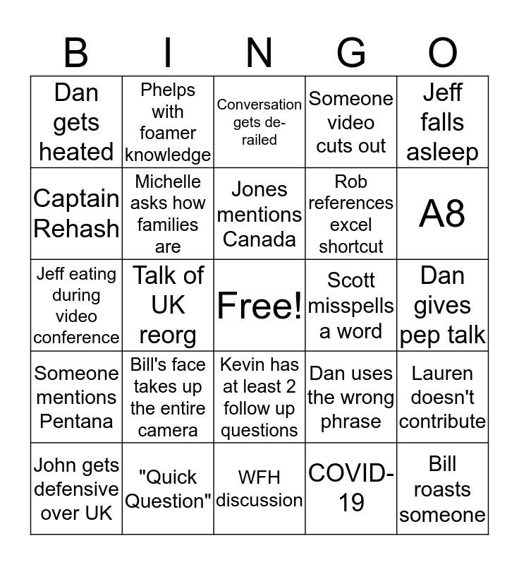 This bingo card has a free space and 24 words: Bill's face takes up the entire camera, "Quick Question", Jones mentions Canada, John gets defensive over UK, Jeff falls asleep, Dan gets heated, Captain Rehash, Phelps with foamer knowledge, Scott misspells a word, Kevin has at least 2 follow up questions, Rob references excel shortcut, Jeff eating during video conference, Dan uses the wrong phrase, Lauren doesn't contribute, Michelle asks how families are, COVID-19, Dan gives pep talk, Conversation gets de-railed, A8, Talk of UK reorg, Bill roasts someone, Someone mentions Pentana, Someone video cuts out and WFH discussion.