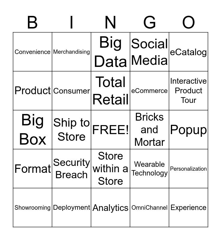 This bingo card has a free space and 59 words: Branding, Deployment, Design, Format, OmniChannel, Product Video, Consumer, Mobile app, eCommerce, TwoWay, Social Media, Interactive, Product, Multimedia, Deliverables, Convenience, Experience, eCatalog, Campaign, Total Retail, Bricks and Mortar, Big Data, Showrooming, Personalization, InStore, Technology, Geofencing, Crowdsourcing, Interactive Product Tour, SpeedtoMarket, Tech Wars, Socially Conscious, eTailers, Mobile POS, Merchandising, Data Asset Management, Creative Workflow Management, Ship to Store, Millennials, Big Box, Content Consistency, Security Breach, Popup, Storefront, Group Buying, Touchpoints, Key Performance Indicators, Platform, Store within a Store, Analytics, Cloud, On Brand, 360s, Retargeting, Advocacy, Wearable Technology, Predictive Metrics, Offline/Online Retail and Total Retail.