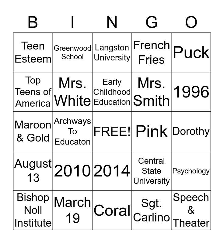 This bingo card has a free space and 24 words: 2010, March 19, Early Childhood Education, Bishop Noll Institute, Puck, Teen Esteem, Top Teens of America, Greenwood School, Pink, 2014, Mrs. Smith, Maroon & Gold, Central State University, Psychology, Mrs. White, Sgt. Carlino, Dorothy, Langston University, 1996, Archways To Educaton, Speech & Theater, August 13, French Fries and Coral.