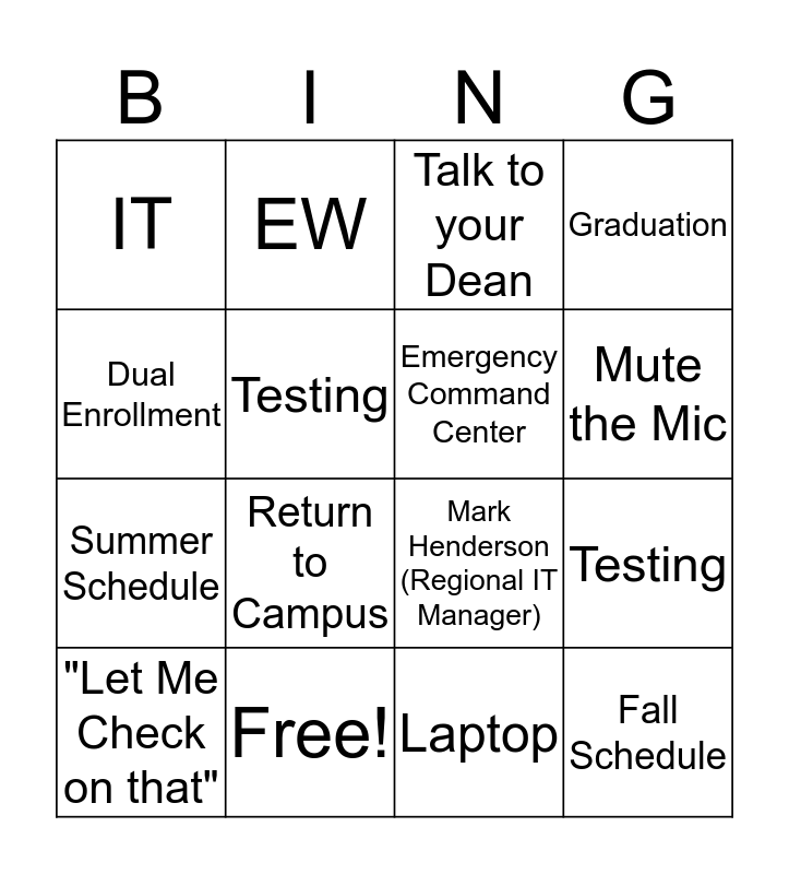This bingo card has 21 words: Free!, VPN, EW, Canvas, Laptop, Emergency Command Center, IT, Talk to your Dean, Mark Henderson (Regional IT Manager), Mute the Mic, Summer Schedule, Graduation, Fall Schedule, Hot Mic (Random Mic On), Testing, Zoom Accounts, "Let Me Check on that", Return to Campus, Dual Enrollment, Testing and Virtual Valley.