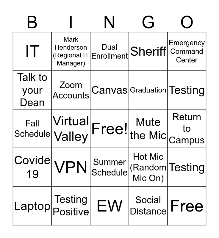 This bingo card has a free space and 25 words: VPN, EW, Canvas, Laptop, Emergency Command Center, IT, Talk to your Dean, Mark Henderson (Regional IT Manager), Mute the Mic, Summer Schedule, Graduation, Fall Schedule, Hot Mic (Random Mic On), Testing, Zoom Accounts, "Let Me Check on that", Return to Campus, Dual Enrollment, Testing, Virtual Valley, Free, Testing Positive, Covide 19, Sheriff and Social Distance.