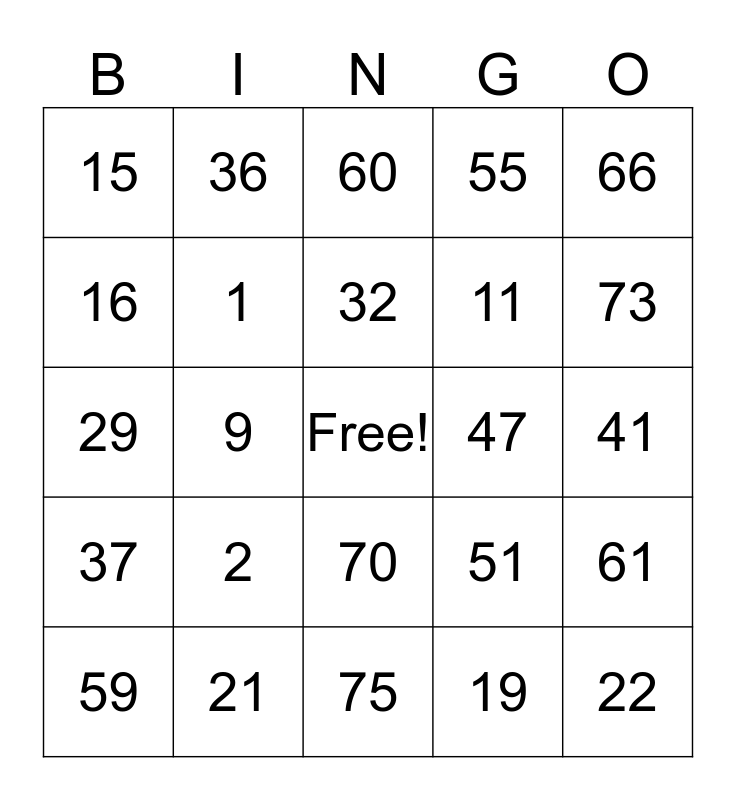 This bingo card has a free space and 24 words: 2, 21, 32, 59, 66, 15, 16, 36, 47, 70, 11, 29, 51, 61, 1, 19, 41, 60, 73, 9, 22, 37, 55 and 75.