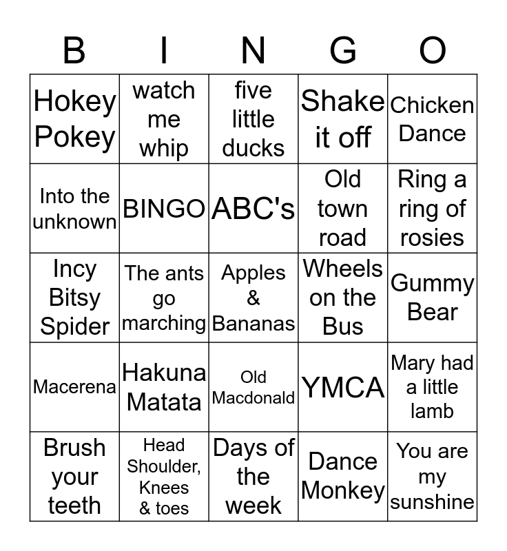This bingo card has 40 words: Row your boat, Incy Bitsy Spider, Twinkle Little Star, BINGO, Head Shoulder, Knees & toes, Old Macdonald, ABC's, If your happy and.., Chicken Dance, Macerena, The ants go marching, Shake it off, Apples & Bananas, Gummy Bear, Wheels on the Bus, Hakuna Matata, Let it go, Hokey Pokey, Baby Shark, five little ducks, Mary had a little lamb, Dance Monkey, Old town road, Into the unknown, Cant stop the feeling, Down by the bay, Do you want to build a snowman, Hickory Dickory Dock, You are my sunshine, Its raining its pouring, Baby bumblebee, Brush your teeth, I like to move it, YMCA, Ring a ring of rosies, Days of the week, open shut them, Im HAPPY, watch me whip and who let the dogs out.