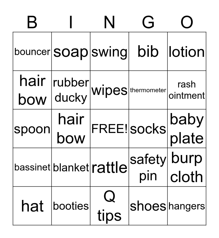 This bingo card has a free space and 31 words: Q tips, doll, hair bow, diaper, bouncer, swing, rubber ducky, safety pin, socks, shoes, baby plate, hangers, stroller, pacifier, rash ointment, books, burp cloth, blanket, bassinet, rattle, lotion, baby oil, hat, soap, thermometer, hair bow, bib, spoon, booties, wipes and tub.