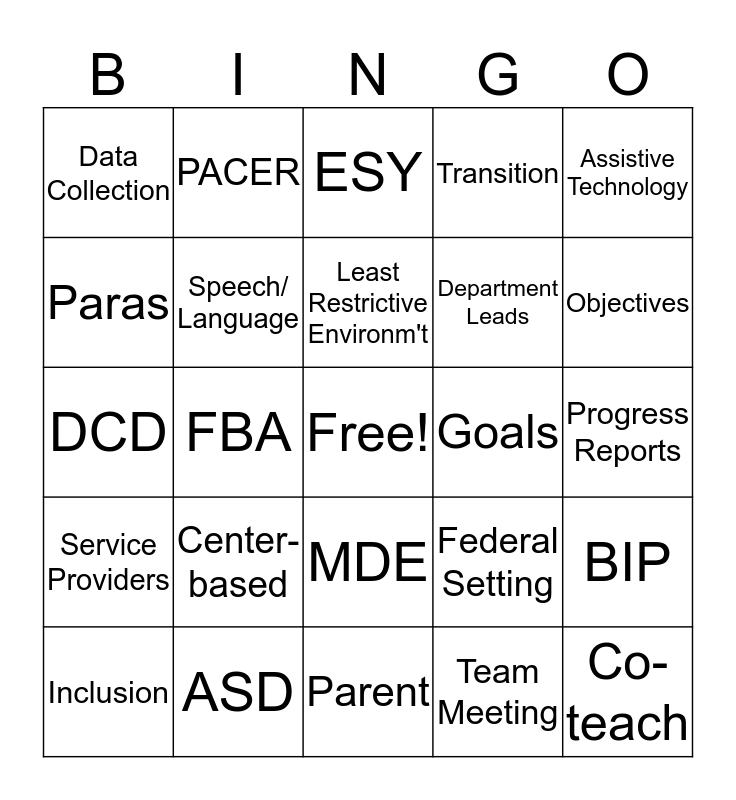 This bingo card has a free space and 34 words: IEP, Team Meeting, SLD, EBD, Service Providers, Speech/ Language, Assistive Technology, Inclusion, PACER, Accommodations, Least Restrictive Environm't, ESY, SPED Supervisors, Case Manager, Goals, Objectives, ASD, DCD, Center-based, Federal Setting, MDE, Strengths, Data Collection, Progress Reports, Parent, Co-teach, Transition, EvaluationSummary Report, Department Leads, Paras, Resource Room, FBA, BIP and General Ed.