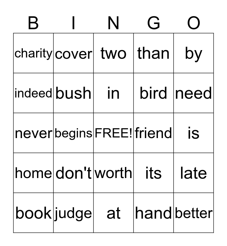 This bingo card has a free space and 24 words: don't, judge, in, book, by, charity, indeed, cover, friend, worth, bird, never, its, late, bush, hand, is, two, need, begins, better, home, than and at.