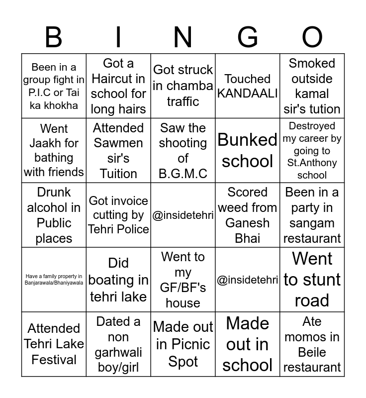 This bingo card has a free space and 25 words: Did boating in tehri lake, Made out in Picnic Spot, Saw the shooting of B.G.M.C, Attended Tehri Lake Festival, Smoked outside kamal sir's tution, Been in a group fight in P.I.C or Tai ka khokha, Went Jaakh for bathing with friends, Got a Haircut in school for long hairs, Scored weed from Ganesh Bhai, Went to my GF/BF's house, Bunked school, Drunk alcohol in Public places, @insidetehri, Went to stunt road, Attended Sawmen sir's Tuition, Participated in school's annual function, Been in a party in sangam restaurant, Got struck in chamba traffic, Destroyed my career by going to St.Anthony school, Got invoice cutting by Tehri Police, Ate momos in Beile restaurant, Dated a non garhwali boy/girl, Have a family property in Banjarawala/Bhaniyawala, Touched KANDAALI and Made out in school.