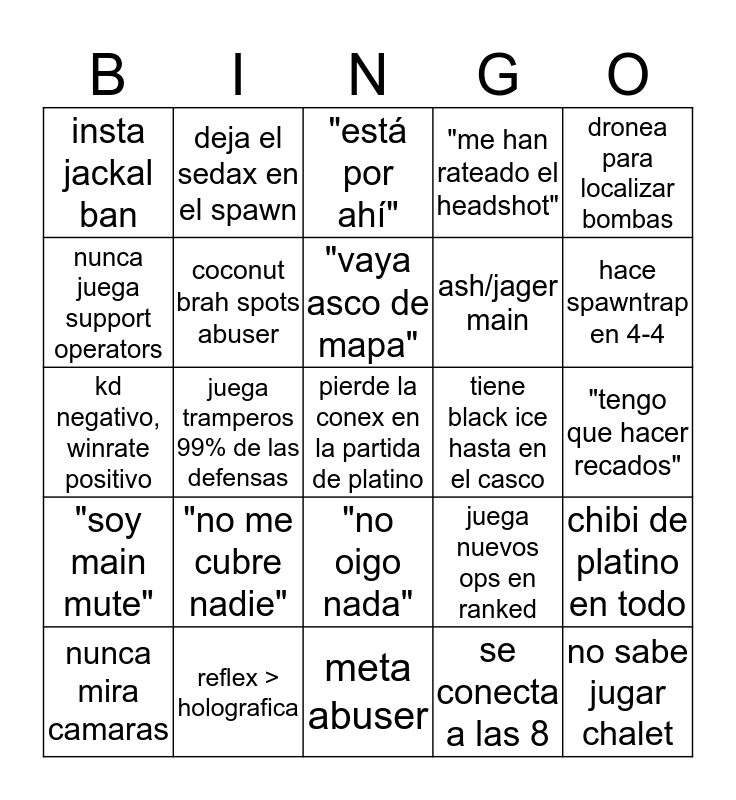 This bingo card has a free space and 24 words: "no me cubre nadie", reflex > holografica, "vaya asco de mapa", nunca mira camaras, dronea para localizar bombas, insta jackal ban, nunca juega support operators, deja el sedax en el spawn, tiene black ice hasta en el casco, "no oigo nada", ash/jager main, kd negativo, winrate positivo, juega nuevos ops en ranked, chibi de platino en todo, coconut brah spots abuser, se conecta a las 8, "tengo que hacer recados", "está por ahí", hace spawntrap en 4-4, juega tramperos 99% de las defensas, no sabe jugar chalet, "soy main mute", "me han rateado el headshot" and meta abuser.