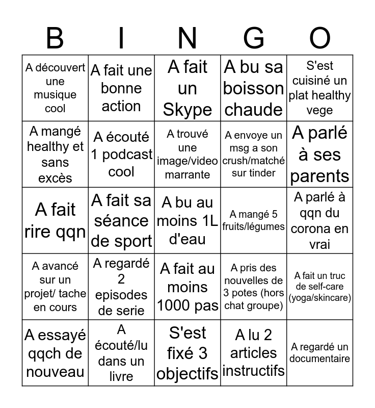 This bingo card has a free space and 24 words: A regardé 2 episodes de serie, A écouté/lu dans un livre, A trouvé une image/video marrante, A essayé qqch de nouveau, S'est cuisiné un plat healthy vege, A découvert une musique cool, A mangé healthy et sans excès, A fait une bonne action, A mangé 5 fruits/légumes, A fait au moins 1000 pas, A envoye un msg a son crush/matché sur tinder, A fait rire qqn, A pris des nouvelles de 3 potes (hors chat groupe), A fait un truc de self-care (yoga/skincare), A écouté 1 podcast cool, A lu 2 articles instructifs, A parlé à qqn du corona en vrai, A fait un Skype, A parlé à ses parents, A fait sa séance de sport, A regardé un documentaire, A avancé sur un projet/ tache en cours, A bu sa boisson chaude and S'est fixé 3 objectifs.