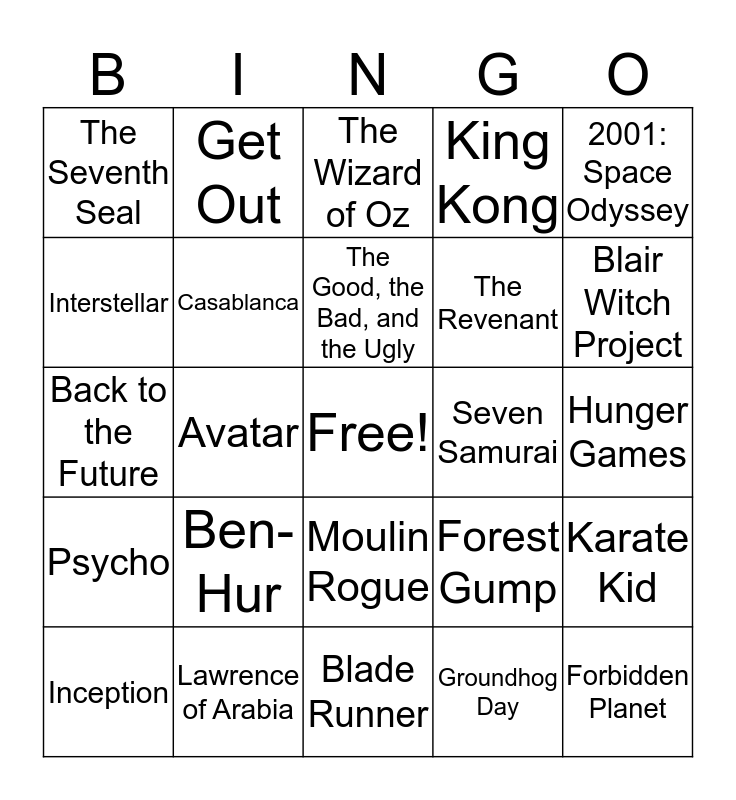This bingo card has a free space and 26 words: Moulin Rogue, Groundhog Day, The Good, the Bad, and the Ugly, Lawrence of Arabia, 2001: Space Odyssey, The Seventh Seal, Interstellar, Get Out, Hunger Games, Forest Gump, The Revenant, Back to the Future, Karate Kid, Inception, Avatar, Batman, King Kong, Psycho, The Wizard of Oz, Forbidden Planet, Blair Witch Project, Blade Runner, Seven Samurai, Ben-Hur, Casablanca and The Day the Earth Stood Still.