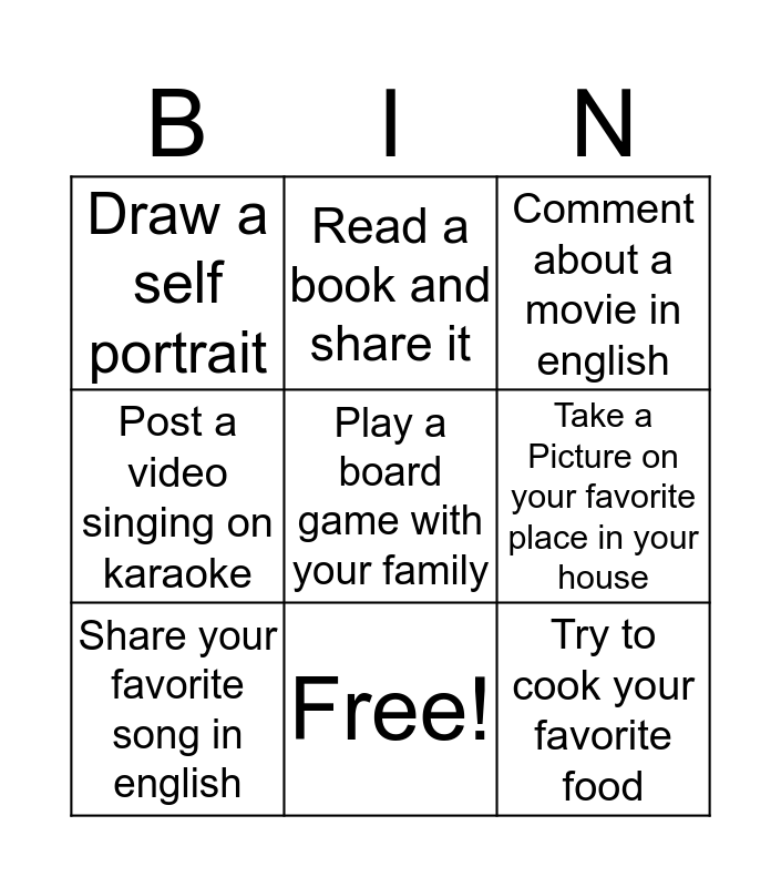 This bingo card has 9 words: Share your favorite song in english, Comment about a movie in english, Read a book and share it, Post a video singing on karaoke, Draw a self portrait, Take a Picture on your favorite place in your house, Play a board game with your family, Try to cook your favorite food and Free!.