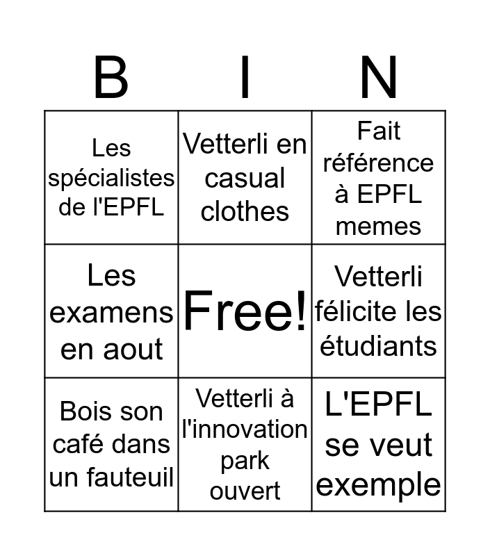 This bingo card has a free space and 8 words: Vetterli félicite les étudiants, Fait référence à EPFL memes, Vetterli en casual clothes, Bois son café dans un fauteuil, Les spécialistes de l'EPFL, L'EPFL se veut exemple, Les examens en aout and Vetterli à l'innovation park ouvert.