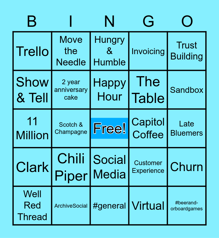 This bingo card has a free space and 99 words: Salesforce, SalesOps, Economy $199, Hungry & Humble, Web Snapshots, Freedom of Info, Archiving, Ops, Pragmatic Perfection, ArchieBot, Premium $599, Marketing, Dev Team, Social Media, AEs, Trello, Move the Needle, Standard $399, SDRs, Quickbooks, LaughStaff, Work Laugh, Garden Club, Stand-Up, Diversity Series, Churn, Happy Hour, Slack, #doggos, #random, #general, Virtual, Work from Home, OG FireSide Chat, Scotch & Champagne, 11 Million, Field Day, #kittehs, Bull McCabes, Chili Piper, Trello, Sandbox, Invoicing, ArchiveSocial, CSMs, AMs, Engineers, Architect, Foosball, Ping Pong, 3D printed animals, #beerand-orboardgames, Customer Experience, Architect, Dev Ops, Dev Advocate, Digital Marketing Specialist, Marketing Specialist, Analytics & Ops, Web Designer & Nurturing Specialist, Core Values, Post-Holiday Partay, Side-By-Side Comparison, Archie’s Seashells, Gorgeous Lawyer, Google Chrome Updates, Trust Building, Instacart, Mati, Diet Coke, Clark, Team Lunch, The Table, Show & Tell, Hard Cider, IPA, CHAWLA, 2 year anniversary cake, Vonage, States, Inclusion, Capitol Coffee, Bronze Bug Award, Golden Quill, Captain Crunch Award, #10 million thread count, CAWS, Green Like Money, Not from Concentrate, Late Bluemers, Well Red Thread, May The 4th Be With You, Expensify, Ops Request Form, Raleigh Office, Customers, Brain Food, Emojis, ASUG and Google Suite.