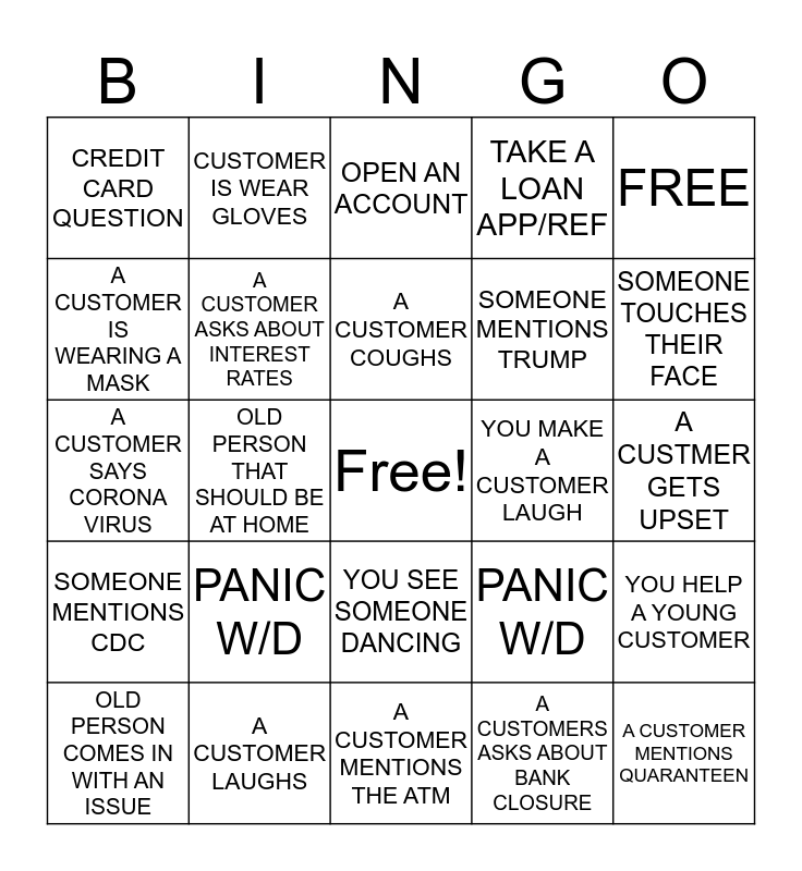 This bingo card has a free space and 24 words: PANIC W/D, A CUSTOMER LAUGHS, A CUSTOMER COUGHS, OLD PERSON COMES IN WITH AN ISSUE, FREE, CREDIT CARD QUESTION, A CUSTOMER IS WEARING A MASK, CUSTOMER IS WEAR GLOVES, YOU MAKE A CUSTOMER LAUGH, YOU SEE SOMEONE DANCING, SOMEONE MENTIONS TRUMP, A CUSTOMER SAYS CORONA VIRUS, PANIC W/D, YOU HELP A YOUNG CUSTOMER, A CUSTOMER ASKS ABOUT INTEREST RATES, A CUSTOMERS ASKS ABOUT BANK CLOSURE, A CUSTMER GETS UPSET, OPEN AN ACCOUNT, SOMEONE TOUCHES THEIR FACE, OLD PERSON THAT SHOULD BE AT HOME, A CUSTOMER MENTIONS QUARANTEEN, SOMEONE MENTIONS CDC, TAKE A LOAN APP/REF and A CUSTOMER MENTIONS THE ATM.