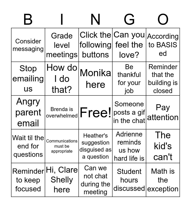 This bingo card has a free space and 28 words: Fekenhour asks a question, Hi, Clare Shelly here, Monika here, Student hours discussed, According to BASIS ed, Consider messaging, How do I do that?, Can we not chat during the meeting, Someone posts a gif in the chat, The kid's can't, Angry parent email, Brenda is overwhelmed, Adrienne reminds us how hard life is, Math is the exception, Stop emailing us, Stop answering emails from the kids, Heather's suggestion disguised as a question, Can you feel the love?, Reminder that the building is closed, Reminder to keep focused, Grade level meetings, Someone cries, Be thankful for your job, Pay attention, Wait til the end for questions, Communications must be appropriate, Click the following buttons and Balancing rigor with ease.