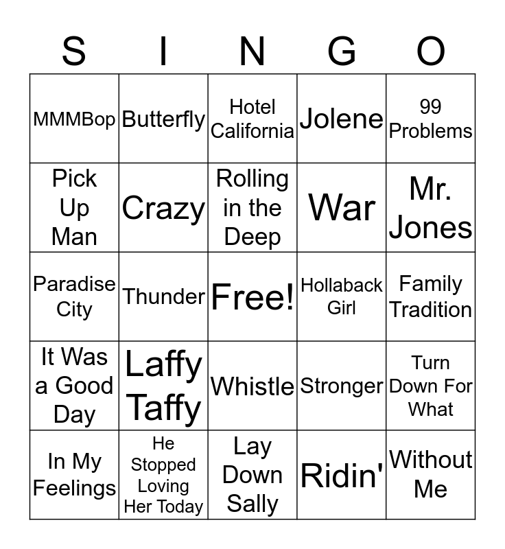 This bingo card has a free space and 24 words: Laffy Taffy, He Stopped Loving Her Today, Rolling in the Deep, In My Feelings, 99 Problems, MMMBop, Pick Up Man, Butterfly, Hollaback Girl, Whistle, War, Paradise City, Stronger, Turn Down For What, Crazy, Ridin', Family Tradition, Hotel California, Mr. Jones, Thunder, Without Me, It Was a Good Day, Jolene and Lay Down Sally.