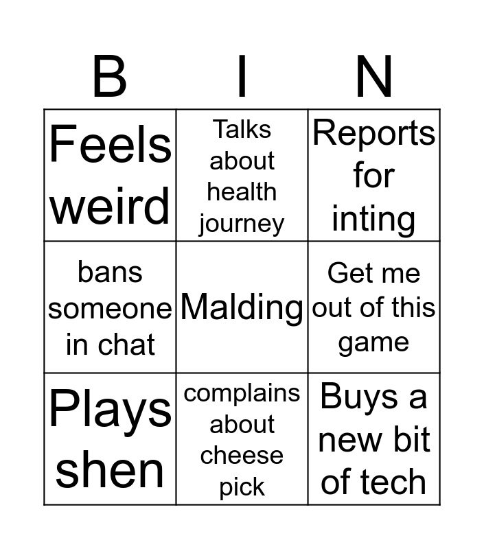 This bingo card has a free space and 8 words: Get me out of this game, Reports for inting, Talks about health journey, Plays shen, Feels weird, Buys a new bit of tech, bans someone in chat and complains about cheese pick.