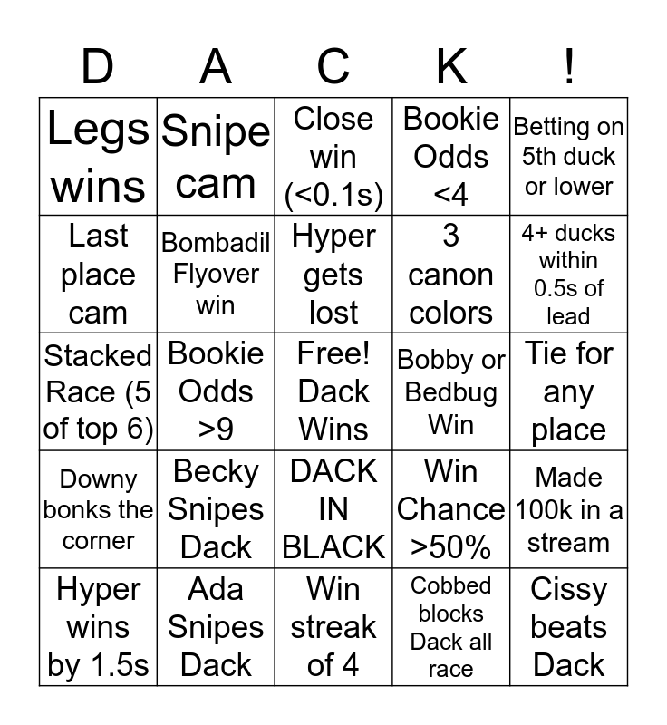 This bingo card has a free space and 24 words: Becky Snipes Dack, Ada Snipes Dack, Hyper gets lost, Hyper wins by 1.5s, Betting on 5th duck or lower, Legs wins, Last place cam, Snipe cam, Bobby or Bedbug Win, DACK IN BLACK, 3 canon colors, Stacked Race (5 of top 6), Win Chance >50%, Made 100k in a stream, Bombadil Flyover win, Cobbed blocks Dack all race, Tie for any place, Close win (<0.1s), 4+ ducks within 0.5s of lead, Bookie Odds >9, Cissy beats Dack, Downy bonks the corner, Bookie Odds <4 and Win streak of 4.