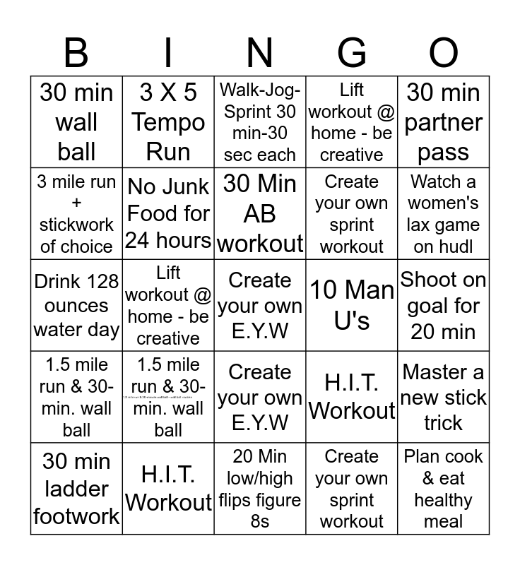 This bingo card has 1 images and 25 words: 1.5 mile run & 30-min. wall ball, 20 Min low/high flips figure 8s, 30 Min AB workout, 30 min ladder footwork, 30 min partner pass, 30 min wall ball, 3 mile run + stickwork of choice, 3 X 5 Tempo Run, 10 Man U's, Create your own E.Y.W, Create your own sprint workout, Drink 128 ounces water day, H.I.T. Workout, Master a new stick trick, No Junk Food for 24 hours, Plan cook & eat healthy meal, Shoot on goal for 20 min, Walk-Jog-Sprint 30 min-30 sec each, Watch a women's lax game on hudl, Lift workout @ home - be creative, Create your own E.Y.W, H.I.T. Workout, 1.5 mile run & 30-min. wall ball, Lift workout @ home - be creative and Create your own sprint workout.