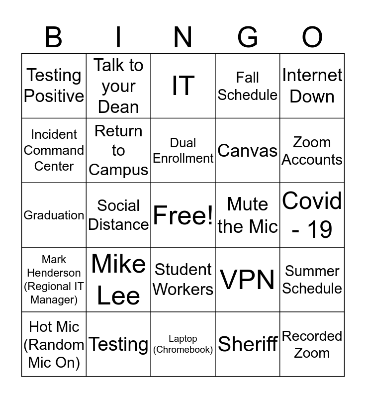 This bingo card has a free space and 27 words: VPN, EW, Canvas, Laptop (Chromebook), Incident Command Center, IT, Talk to your Dean, Mark Henderson (Regional IT Manager), Mute the Mic, Summer Schedule, Graduation, Fall Schedule, Hot Mic (Random Mic On), Testing, Zoom Accounts, "Let Me Check On That", Return to Campus, Dual Enrollment, Mike Lee, Testing Positive, Covid - 19, Sheriff, Social Distance, Recorded Zoom, Student Workers, Internet Down and Faculty Purview.