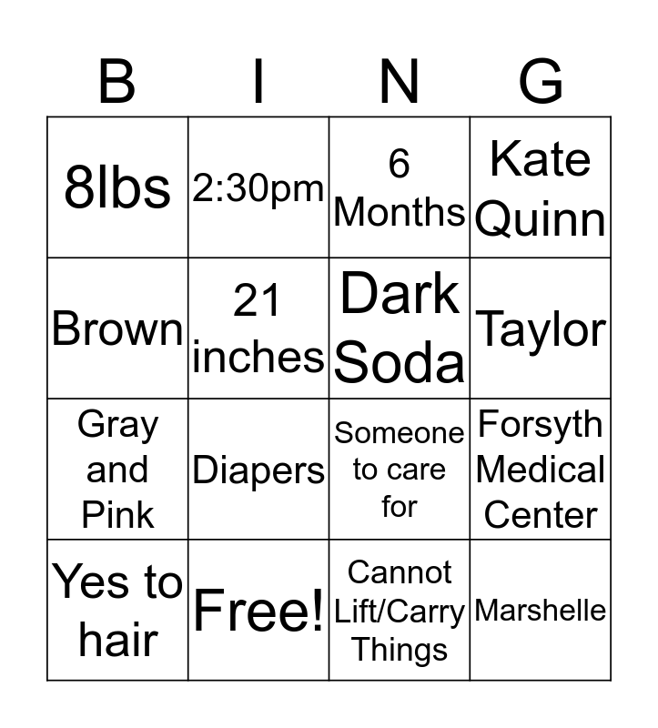 This bingo card has 24 words: Birth, Clothes, Taylor, Black, Brown, 8lbs, 21 inches, 2:30pm, Free!, All, Gray and Pink, Someone to care for, Flowers, 1, Dark Soda, Traveling, Cannot Lift/Carry Things, 6 Months, Diapers, Forsyth Medical Center, Yes to hair, Marshelle, Kate Quinn and Mom.
