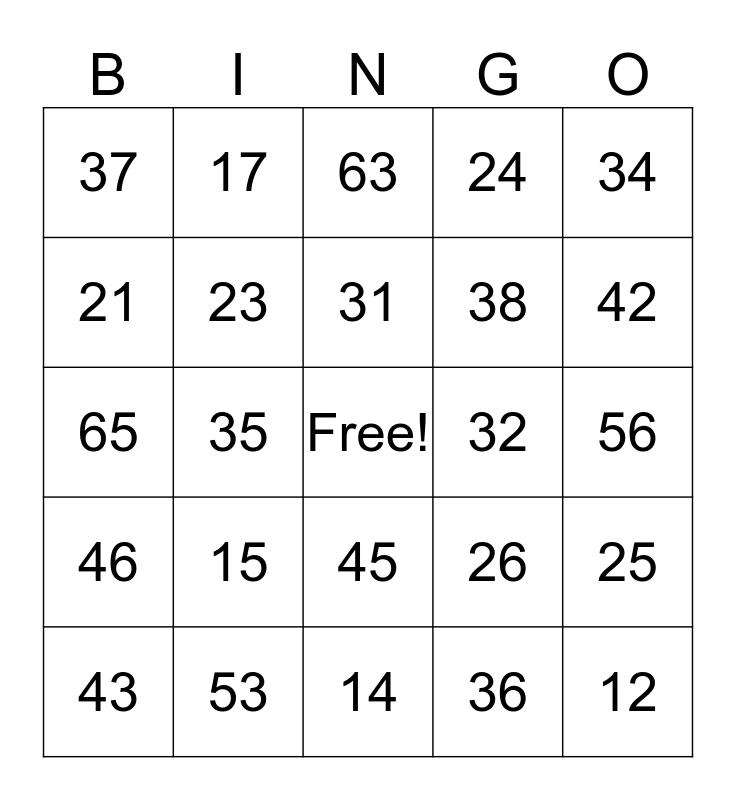 This bingo card has a free space and 48 words: 11, 12, 13, 14, 15, 16, 17, 18, 21, 22, 23, 24, 25, 26, 27, 28, 31, 32, 33, 34, 35, 36, 37, 38, 41, 42, 43, 44, 45, 46, 47, 48, 51, 52, 53, 54, 55, 56, 57, 58, 61, 62, 63, 64, 65, 66, 67 and 68.