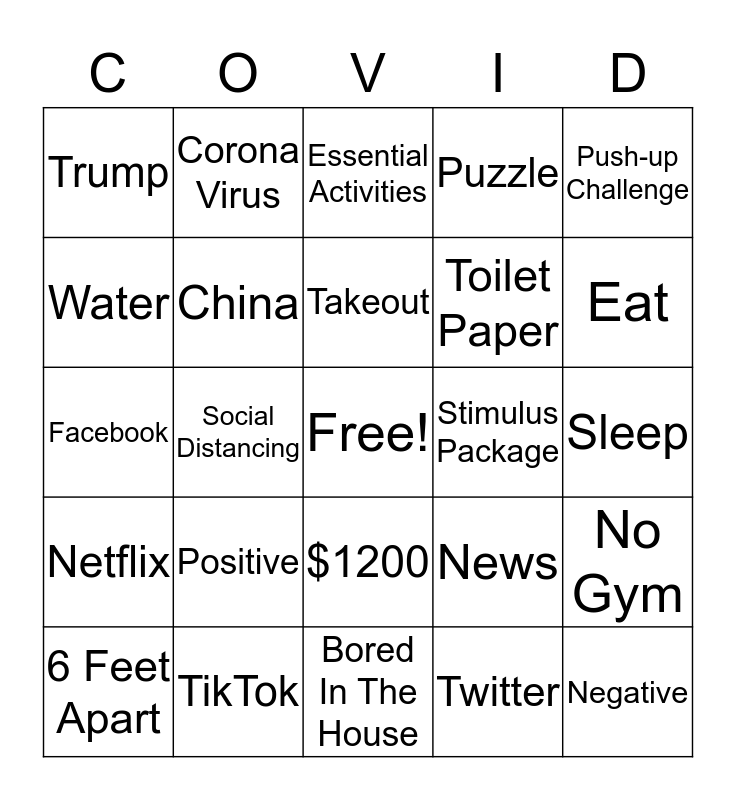 This bingo card has a free space and 29 words: 6 Feet Apart, Quarantine, Social Distancing, COVID-19, Trump, Essential Activities, China, Positive, Stimulus Package, TikTok, Sleep, Negative, Bored In The House, Twitter, Eat, Instagram, $1200, Netflix, Push-up Challenge, Facebook, News, Jobless, Toilet Paper, Water, Puzzle, Corona Virus, No Gym, Takeout and Groceries.