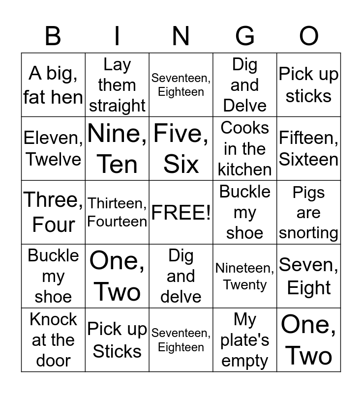 This bingo card has a free space and 24 words: One, Two, Pick up Sticks, Five, Six, Knock at the door, Pick up sticks, A big, fat hen, Eleven, Twelve, Lay them straight, Buckle my shoe, Dig and delve, Cooks in the kitchen, Three, Four, Nineteen, Twenty, Seven, Eight, Nine, Ten, My plate's empty, Pigs are snorting, Seventeen, Eighteen, Fifteen, Sixteen, Thirteen, Fourteen, One, Two, Buckle my shoe, Dig and Delve and Seventeen, Eighteen.