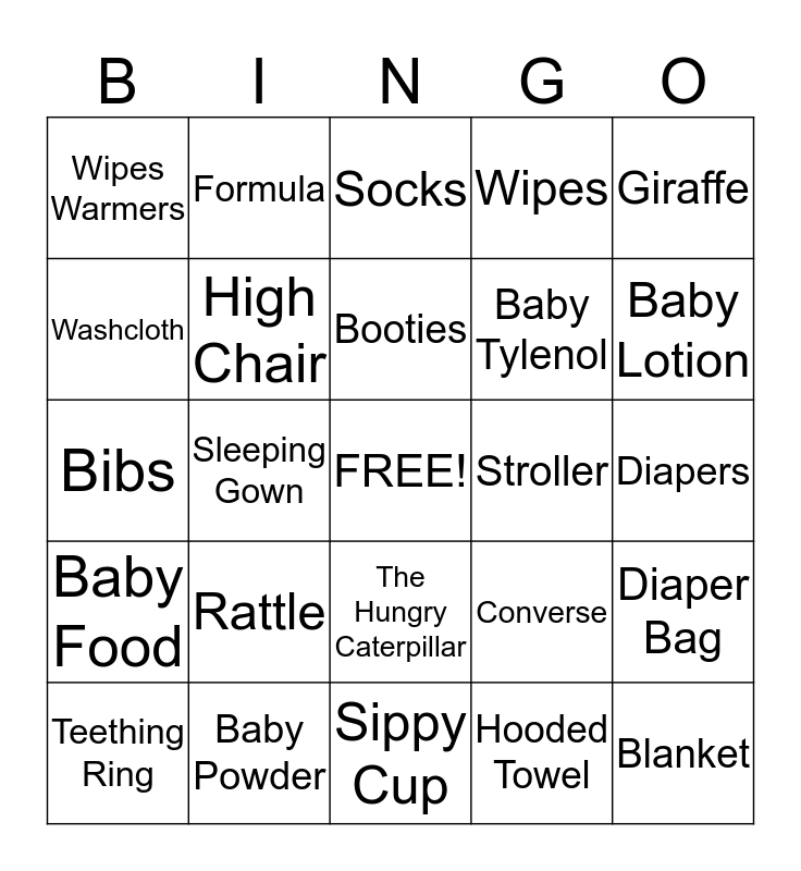 This bingo card has a free space and 24 words: Rattle, Baby Powder, Booties, Teething Ring, Giraffe, Wipes Warmers, Washcloth, Formula, Stroller, The Hungry Caterpillar, Baby Tylenol, Bibs, Converse, Diaper Bag, High Chair, Hooded Towel, Diapers, Socks, Baby Lotion, Sleeping Gown, Blanket, Baby Food, Wipes and Sippy Cup.