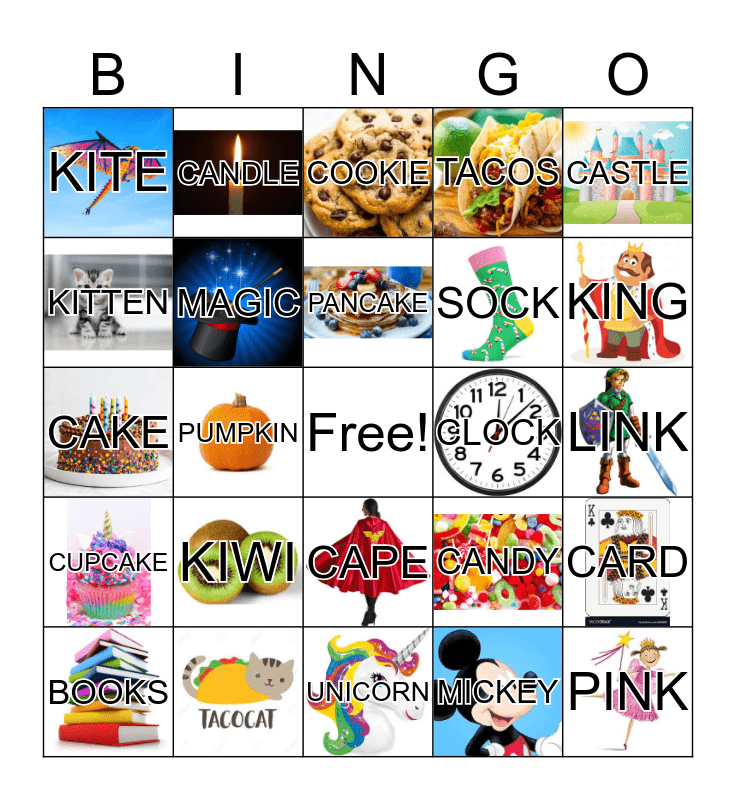 This bingo card has 27 images, a free space and 26 words: CANDY, BAKER, SOCK, UNICORN, KITTEN, COOKIE, CANDLE, CUPCAKE, CLOCK, CARD, CAKE, TACOS, BOOKS, KING, POKEMON, MAGIC, PANCAKE, KIWI, KITE, LINK, MICKEY, PUMPKIN, PINK, CAPE, CASTLE and BIKE.