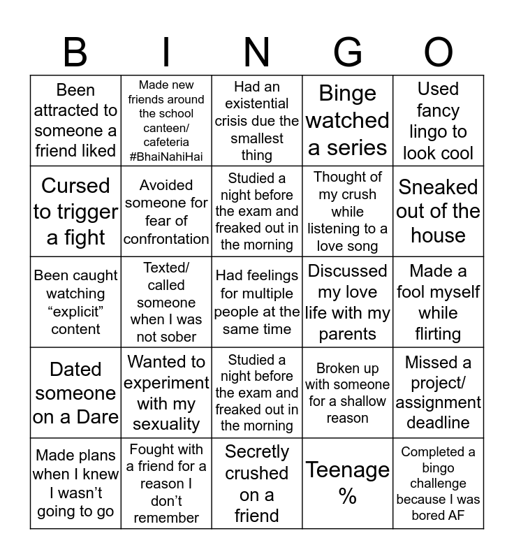 This bingo card has 26 words: Studied a night before the exam and freaked out in the morning, Teenage %, Studied a night before the exam and freaked out in the morning, Fought with a friend for a reason I don’t remember, Used fancy lingo to look cool, Been attracted to someone a friend liked, Cursed to trigger a fight, Made new friends around the school canteen/ cafeteria #BhaiNahiHai, Made a fool myself while flirting, Broken up with someone for a shallow reason, Thought of my crush while listening to a love song, Been caught watching “explicit” content, Missed a project/ assignment deadline, Made plans when I knew I wasn’t going to go, Texted/ called someone when I was not sober, Blamed someone else for my mistake, Binge watched a series, Dated someone on a Dare, Had an existential crisis due the smallest thing, Had feelings for multiple people at the same time, Sneaked out of the house, Secretly crushed on a friend, Discussed my love life with my parents, Wanted to experiment with my sexuality, Avoided someone for fear of confrontation and Completed a bingo challenge because I was bored AF.