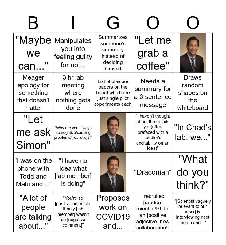 This bingo card has 2 images, a free space and 25 words: "Draconian", "...so these are the leverages I'm balancing...", Needs a summary for a 3 sentence message, Proposes work on COVID19 and..., Meager apology for something that doesn't matter, Summarizes someone's summary instead of deciding himself, Manipulates you into feeling guilty for not..., "I was on the phone with Todd and Malu and...", "I haven't thought about the details yet (often prefaced with a toddler's excitability on an idea)", "What do you think?", "Let me ask Simon", "Let me grab a coffee", "A lot of people are talking about...", "You're so [positive adjective] If only [lab member] wasn't so [negative comment]", Draws random shapes on the whiteboard, "[Someone other than him] had a great idea and...", 3 hr lab meeting where nothing gets done, List of obscure papers on the board which are just single pilot experiments each, "I have no idea what [lab member] is doing", "Maybe we can...", "In Chad's lab, we...", I recruited [random scientist/PI] for an [positive adjective] new collaboration!", "Why are you always so negative/causing problems/(realistic)?!", "[Scientist vaguely relevant to our work] is interviewing next month and..." and "When can you get this done?".