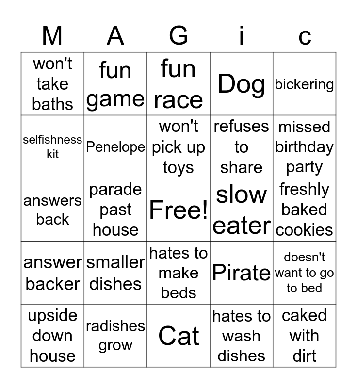 This bingo card has a free space and 24 words: smaller dishes, radishes grow, won't pick up toys, upside down house, bickering, won't take baths, selfishness kit, fun game, slow eater, hates to make beds, refuses to share, answers back, Pirate, doesn't want to go to bed, Penelope, hates to wash dishes, freshly baked cookies, fun race, missed birthday party, parade past house, caked with dirt, answer backer, Dog and Cat.