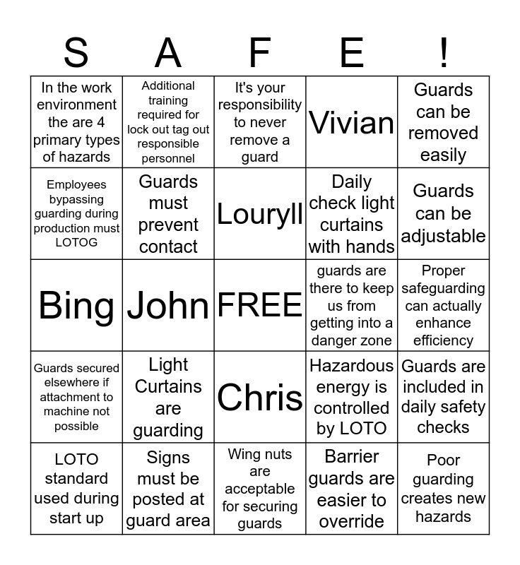This bingo card has a free space and 41 words: Erica, Bing, Ron, Guards must prevent contact, Signs must be posted at guard area, Chris, Louryll, Sukh, Guards can be removed easily, Guards secured elsewhere if attachment to machine not possible, John, Vivian, Poor guarding creates new hazards, Proper safeguarding can actually enhance efficiency, guards are there to keep us from getting into a danger zone, Light Curtains are guarding, Pressure sensitive mats are guarding, In the work environment the are 4 primary types of hazards, Removing a guard is sometimes necessary, It's your responsibility to never remove a guard, Guards are included in daily safety checks, If It's not safe STOP, Wing nuts are acceptable for securing guards, Daily check light curtains with hands, Check light curtain with wand, Barrier guards keeps people out, Barrier guards are easier to override, Fixed guards are permanent, Guards can be adjustable, Lock out tag out stops the machine from turning on, Anyone can lock out tag out, Additional training required for lock out tag out responsible personnel, LOTO standard used during start up, LOTO used when equipment could harm employees, Hazardous energy is controlled by LOTO, Employees bypassing guarding during production must LOTOG, Restarting machinery in a manor that jeopardizes safety is subject to termination, We can remove LOTO devices if area is clear, Speak up if you don't see ECP on equipment, Employees will be notified about equipment to be locked out and No object should fall into moving parts.