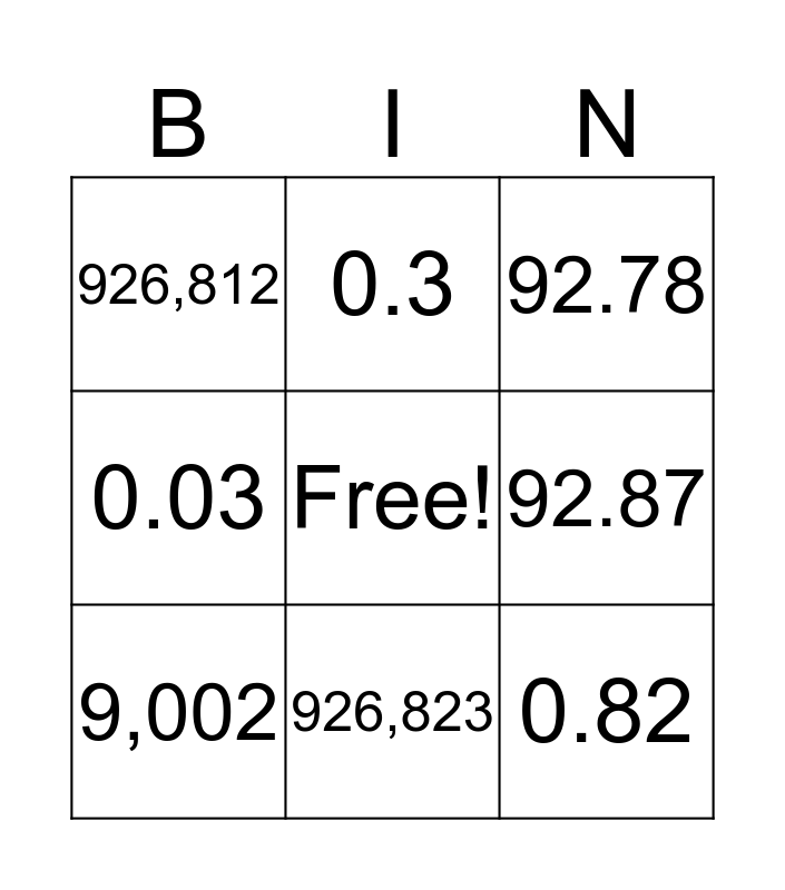 This bingo card has a free space and 14 words: 587,102, 587,012, 9,002, 0.3, 0.03, 0.82, 0.58, 0.9, 926,823, 926,812, 9,020, 92.87, 92.78 and 928.7.