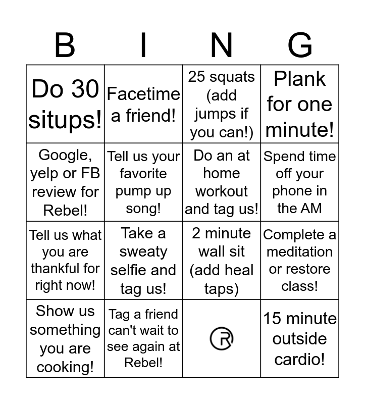 This bingo card has 1 images and 15 words: Tag a friend can't wait to see again at Rebel!, Complete a meditation or restore class!, 25 squats (add jumps if you can!), Do 30 situps!, Tell us what you are thankful for right now!, Facetime a friend!, 2 minute wall sit (add heal taps), Google, yelp or FB review for Rebel!, Tell us your favorite pump up song!, Show us something you are cooking!, Plank for one minute!, Take a sweaty selfie and tag us!, Spend time off your phone in the AM, Do an at home workout and tag us! and 15 minute outside cardio!.